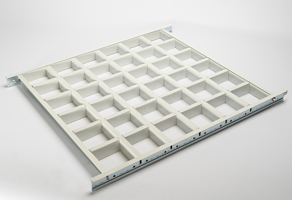 Il controsoffitto in grigliato di produzione CRL Controsoffitti srl è realizzato con nastro di alluminio certificato in euroclasse A1 e composto da listelli ad incastro con sezione a “U” base 15 mm.;