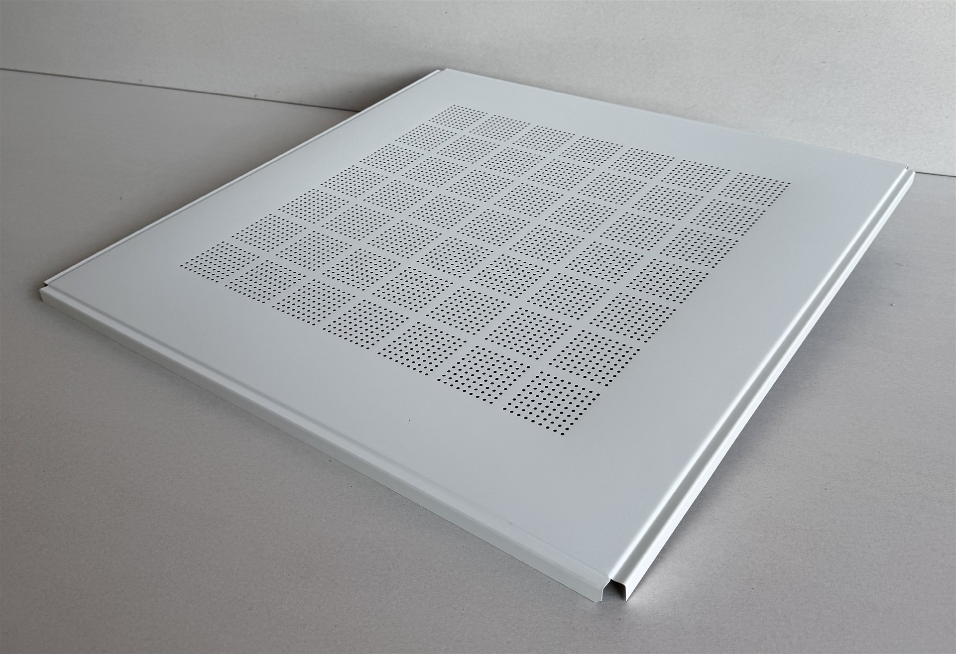 Il controsoffitto può essere realizzato sia in versione liscia, per un effetto minimale, sia in versione forata, ideale per migliorare il comfort acustico degli ambienti. Le forature possono essere circolari, con diametri di 1,5, 2,0 e 2,5 mm, distribuite in modo regolare o diagonale, su area centrale oppure sull’intera superficie del pannello. In alternativa, sono disponibili forature quadrate con diverse combinazioni dimensionali e di passo, applicabili sia sull’intero pannello sia nella sola parte centrale. Per incrementare ulteriormente le prestazioni acustiche, è prevista l’applicazione di tessuto non tessuto nero certificato.